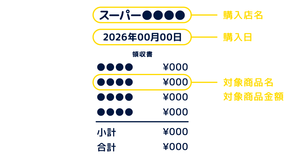 購入店舗、購入日、対象商品名、対象商品金額が写るように撮影してください。